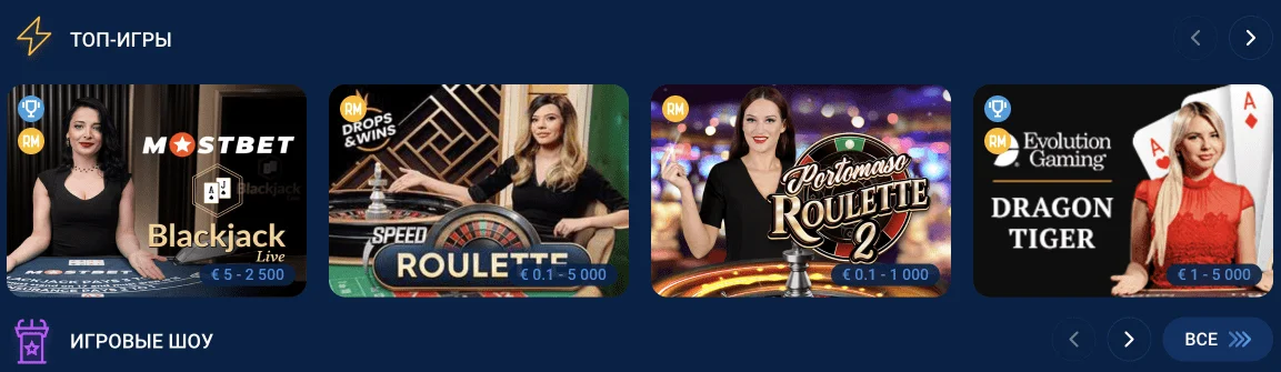 Практически все игры созданы крупнейшими производителями софта – провайдерами Evolution Gaming и Pragmatic Play Live.